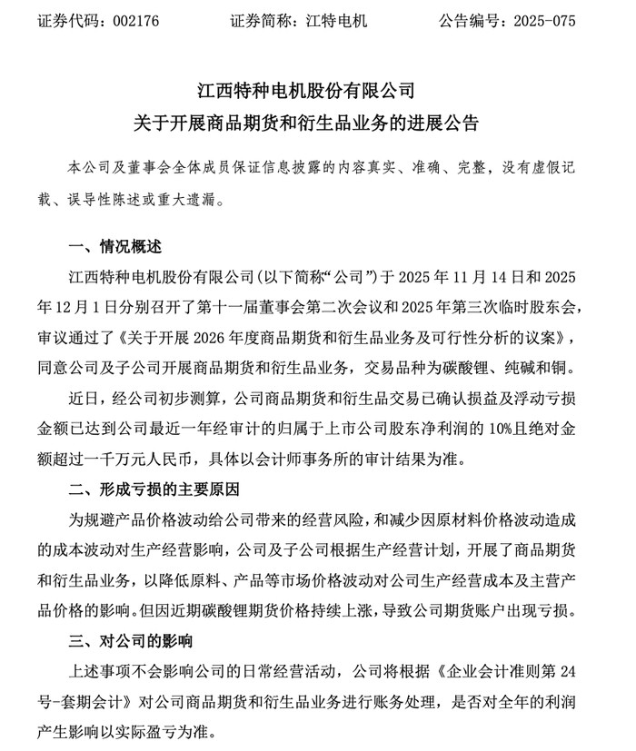 江特电机在公告中解释,开展商品期货和衍生品业务的初衷,是为了规避碳酸锂等产品及原材料的价格波动风险,减少经营不确定性。但事与愿违,近期碳酸锂期货价格持续上涨,导致公司期货账户出现浮亏,初步测算已确认损益及浮动亏损合计超1000万元,达到公司最近一年经审计归母净利润的10%。