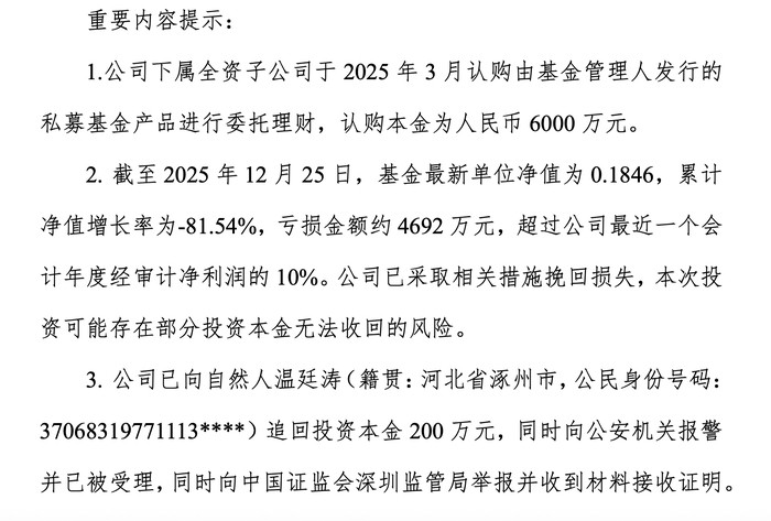 2025年3月,圣元环保全资子公司以6000万元认购“深博宏图成长1号”。前九个月,基金净值表一切正常,直到12月9日公司申请赎回,才发现净值早已从0.9元跌至0.2元区间,累计亏损高达81.54%。经初步核算,本次投资损失规模约4692万元,该金额已突破公司上一会计年度经审计净利润的10%这一阈值。